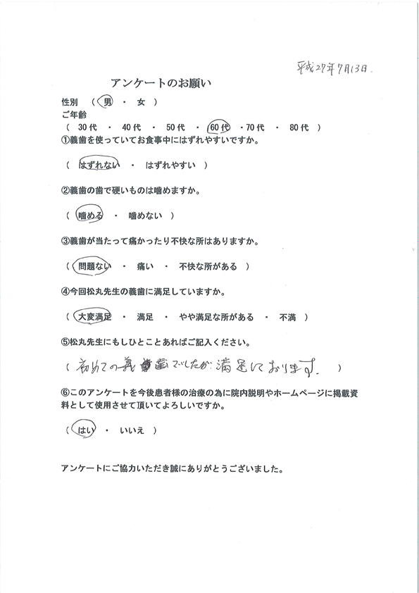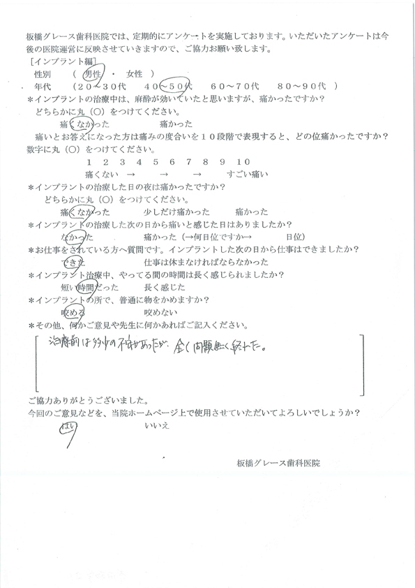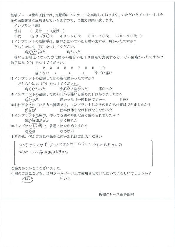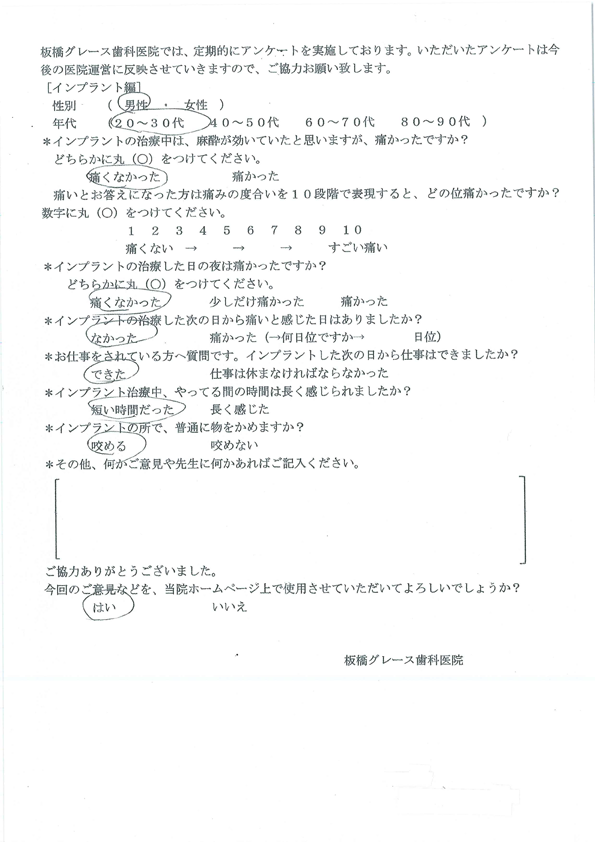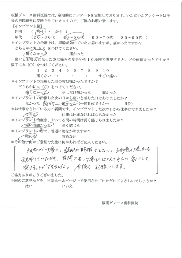 板橋グレース歯科医院では、定期的にアンケートを実施しております。 いただいたアンケートは今後の医院運営に反映させていきます。 ※画像をクリックすると拡大します。