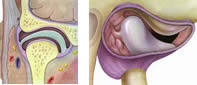 右の図は前から顎関節の中を見たところ、右の図は横から見たところです。淡い黄色の骨と骨の間に水色の円板があり、そのまわりを紫の関節包が覆っています。ここに問題が生じます。