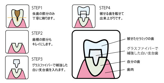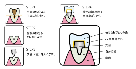 金属の持つ強度と陶材(セラミック)の持つ審美性を兼ねそなえた治療法ということができます。