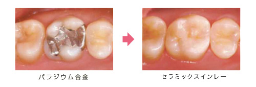 下の画像(左)は保険で詰めたパラジウム合金です。この方法は保険適用ですが、辺縁のわずかな隙間から虫歯になる2次カリエスの危険性が指摘されています。